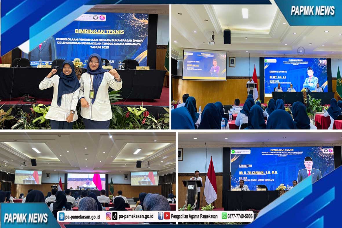 Bendahara Penerimaan dan Kasir Pengadilan Agama Pamekasan, Husna Meta Amalia, S.H., dan Ulfi Laili Amalia, A.Md., A.B., dan mengikuti pembukaan Bimbingan Teknis (Bimtek) Penerimaan Negara Bukan Pajak (PNBP) yang diselenggarakan oleh Pengadilan Tinggi Agama Surabaya di Batu, Malang pada Senin 22 September 2025. Kegiatan ini dilaksanakan bersama 110 peserta dari 38 satuan kerja (satker) di wilayah Jawa Timur. Acara berlangsung dengan khidmat, diawali dengan menyanyikan lagu Indonesia Raya dan Hymne Mahkamah Agung, dan dilanjutkan dengan doa bersama.