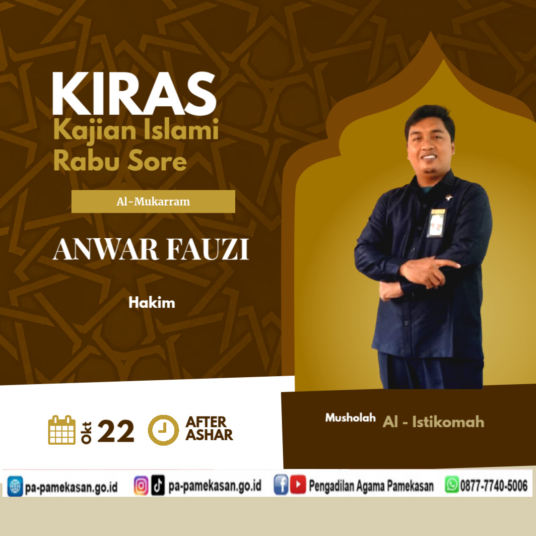 Pengadilan Agama Pamekasan melaksanakan Kegiatan rutin Kajian Islami Rabu Sore (KIRAS) setiap bakda sholat Ashar di Musholla Al Istikomah Pengadilan Agama Pamekasan Rabu 22 Oktober 2025. Kegiatan sholat berjemaah Dhuhur dan Ashar dilakukan rutin setiap hari. Sesuai jadwal Kegiatan Sholat berjemaah yang bertugas menjadi Imam Sholat dhuhur Hakim Pengadilan Agama Pamekasan Bapak Ismail, S.Ag., M.H.I.