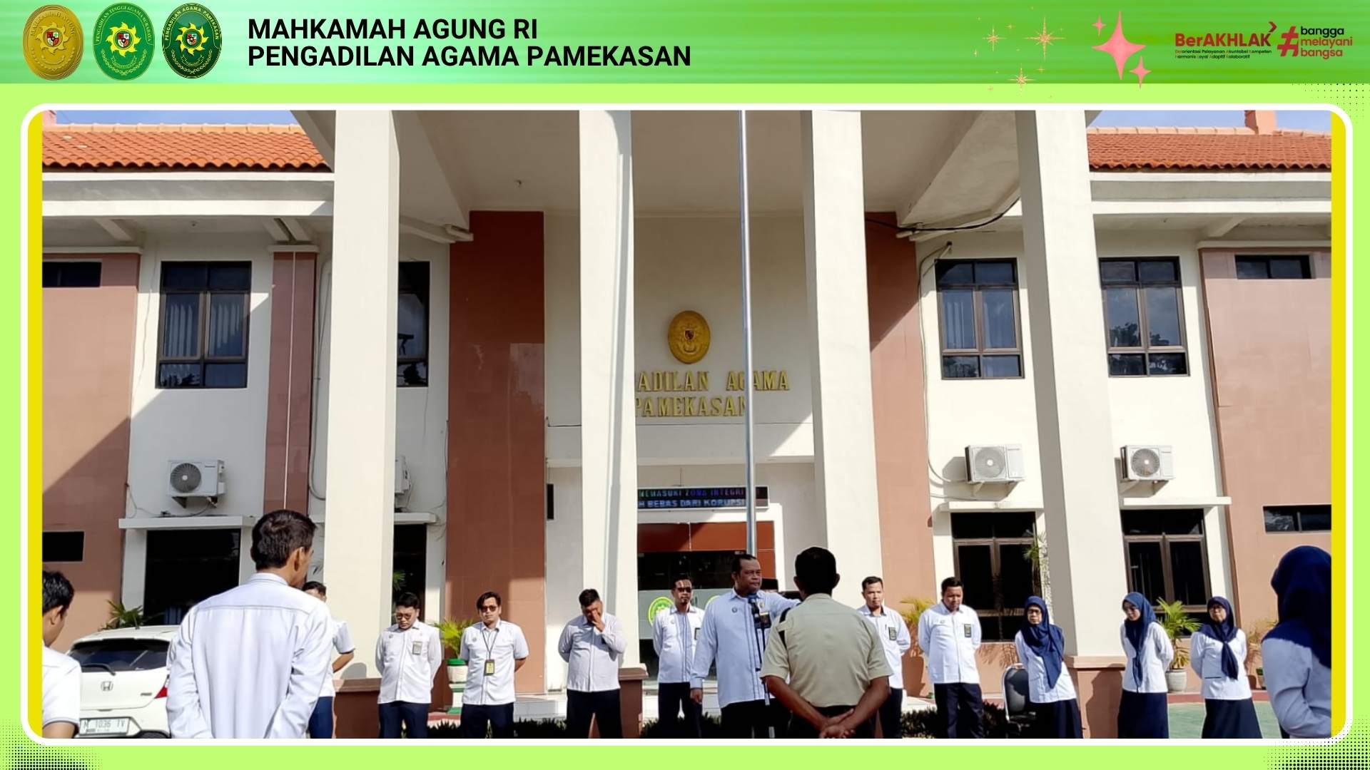Pengadilan Agama (PA) Pamekasan kembali melaksanakan rutinitas apel pagi pada Senin, 06 April 2026, yang bertempat di halaman utama kantor. Kegiatan yang dimulai tepat pukul 08.00 WIB ini diikuti oleh seluruh jajaran hakim, pejabat struktural maupun fungsional, serta staf dan tenaga Outsourcing dan Mahasiswa PPL. Suasana khidmat menyelimuti jalannya apel sebagai bentuk penguatan kedisiplinan dan kesiapan aparatur dalam memulai pekan kerja.