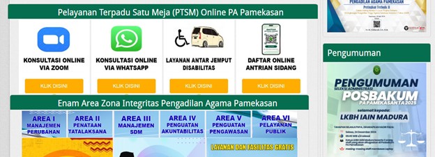 Selain itu, Pengadilan Agama Pamekasan telah meluncurkan PTSM Online, sebuah layanan berbasis digital yang memungkinkan masyarakat untuk mengakses berbagai layanan hukum secara daring. Inovasi ini telah diuji coba langsung oleh Penjabat (PJ) Bupati Pamekasan, yang memberikan apresiasi atas terobosan ini karena dianggap mampu mempermudah pelayanan di era digital.