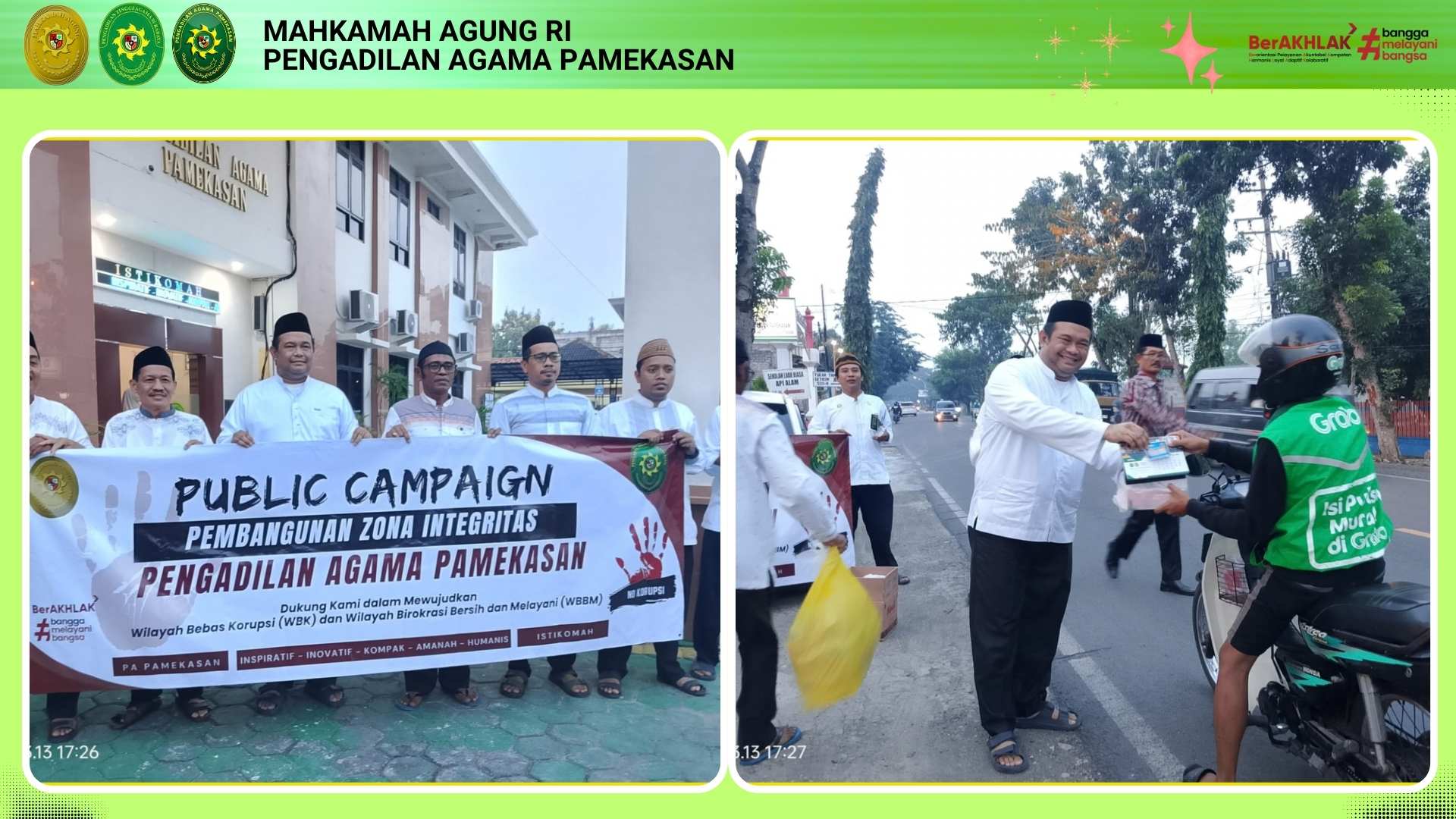 Pengadilan Agama Pamekasan menyelenggarakan kegiatan Public Campaign yang berlokasi di halaman kantor dan jalan raya sekitarnya pada Jumat, 13 Maret 2026. Aksi simpatik ini melibatkan seluruh aparatur yang terjun langsung menyapa masyarakat pengguna jalan di depan kantor PA Pamekasan. Dalam pelaksanaannya, pihak pengadilan membagikan stiker anti korupsi, kalender, serta paket takjil sebagai bentuk kepedulian di bulan suci Ramadhan.
