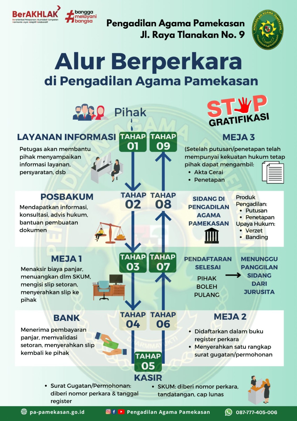 Pihak berperkara menghadap petugas Meja Pertama dan menyerahkan urat gugatan atau permohonan, minimal 2 (dua) rangkap. Untuk surat gugatan ditambah sejumlah Tergugat.